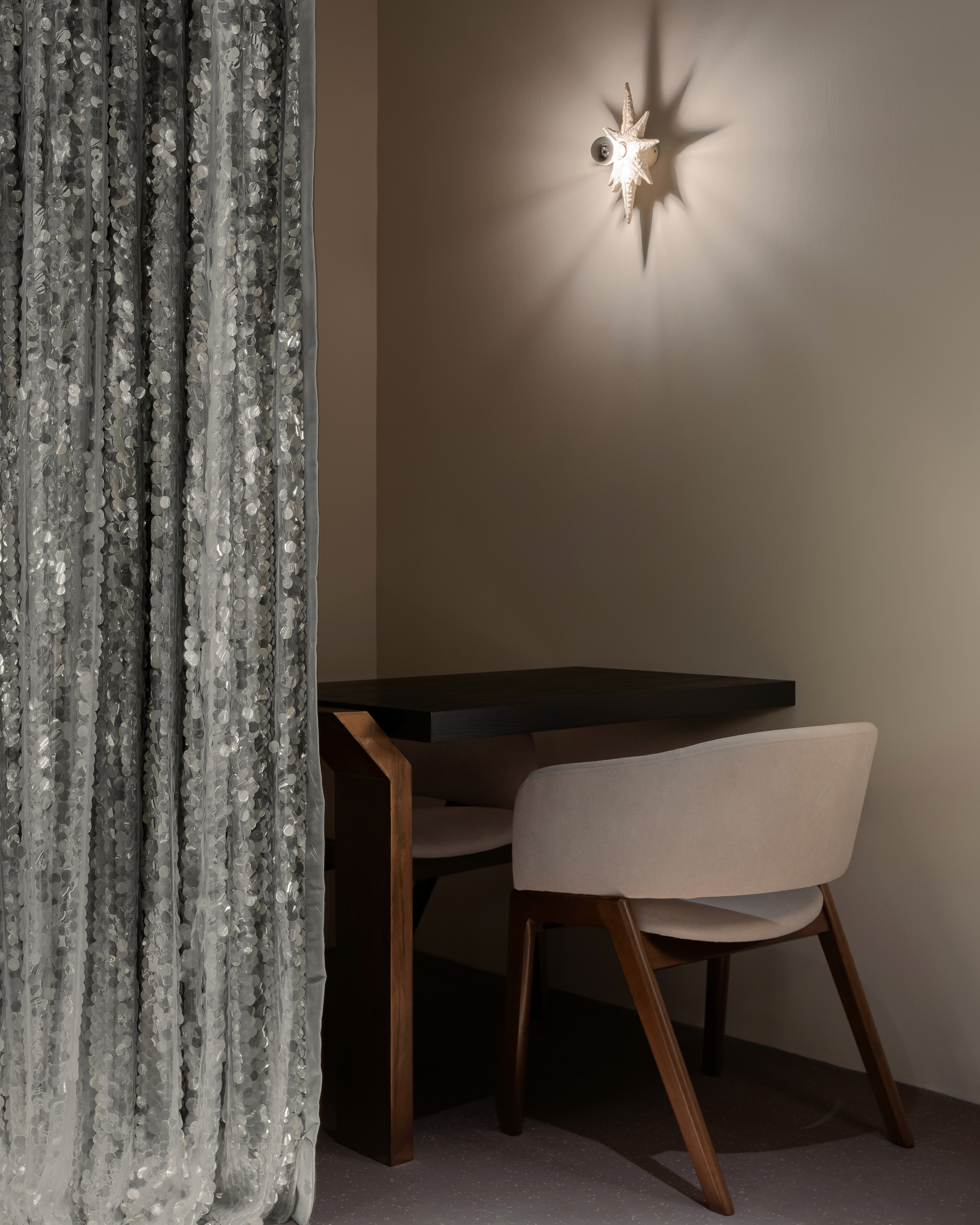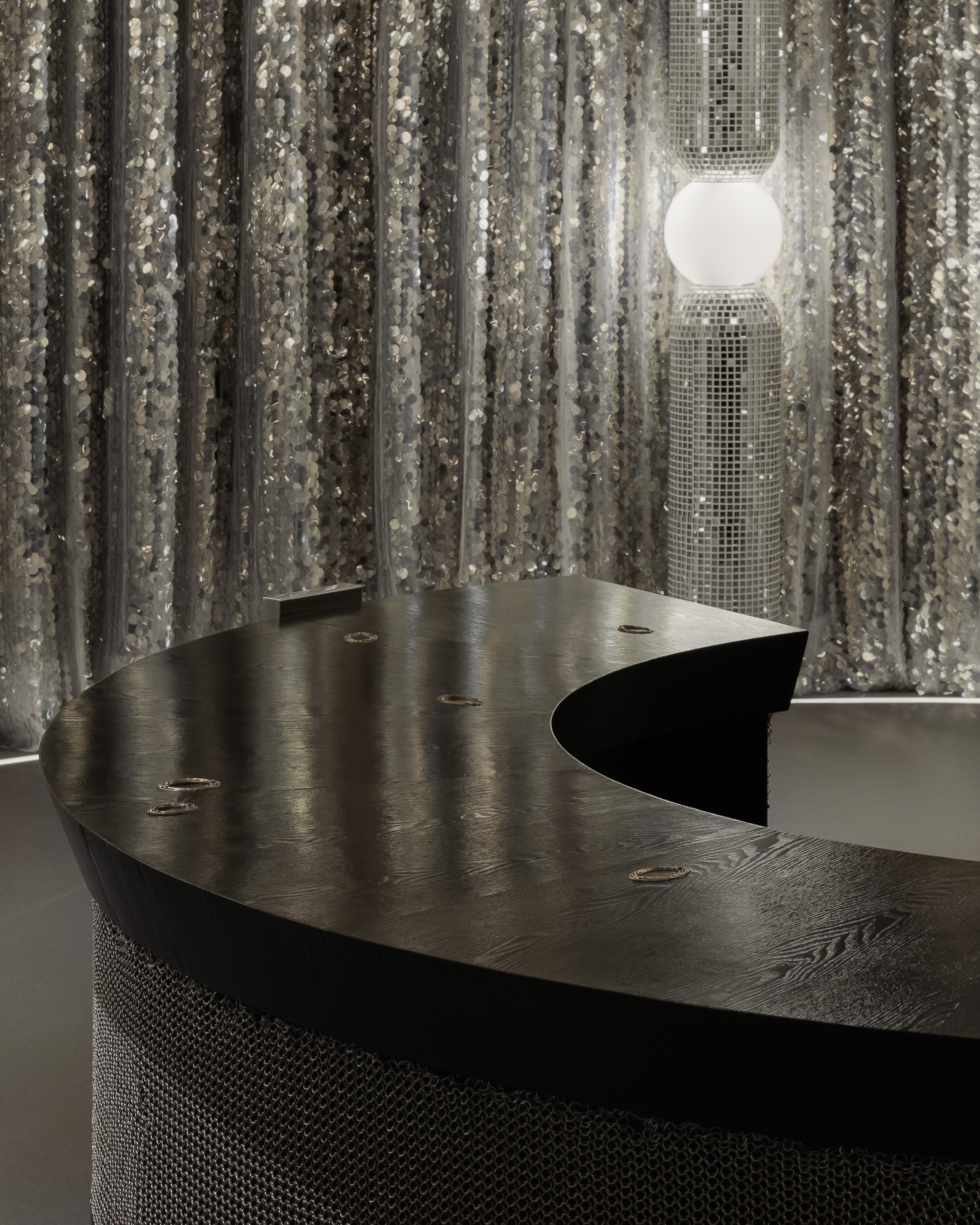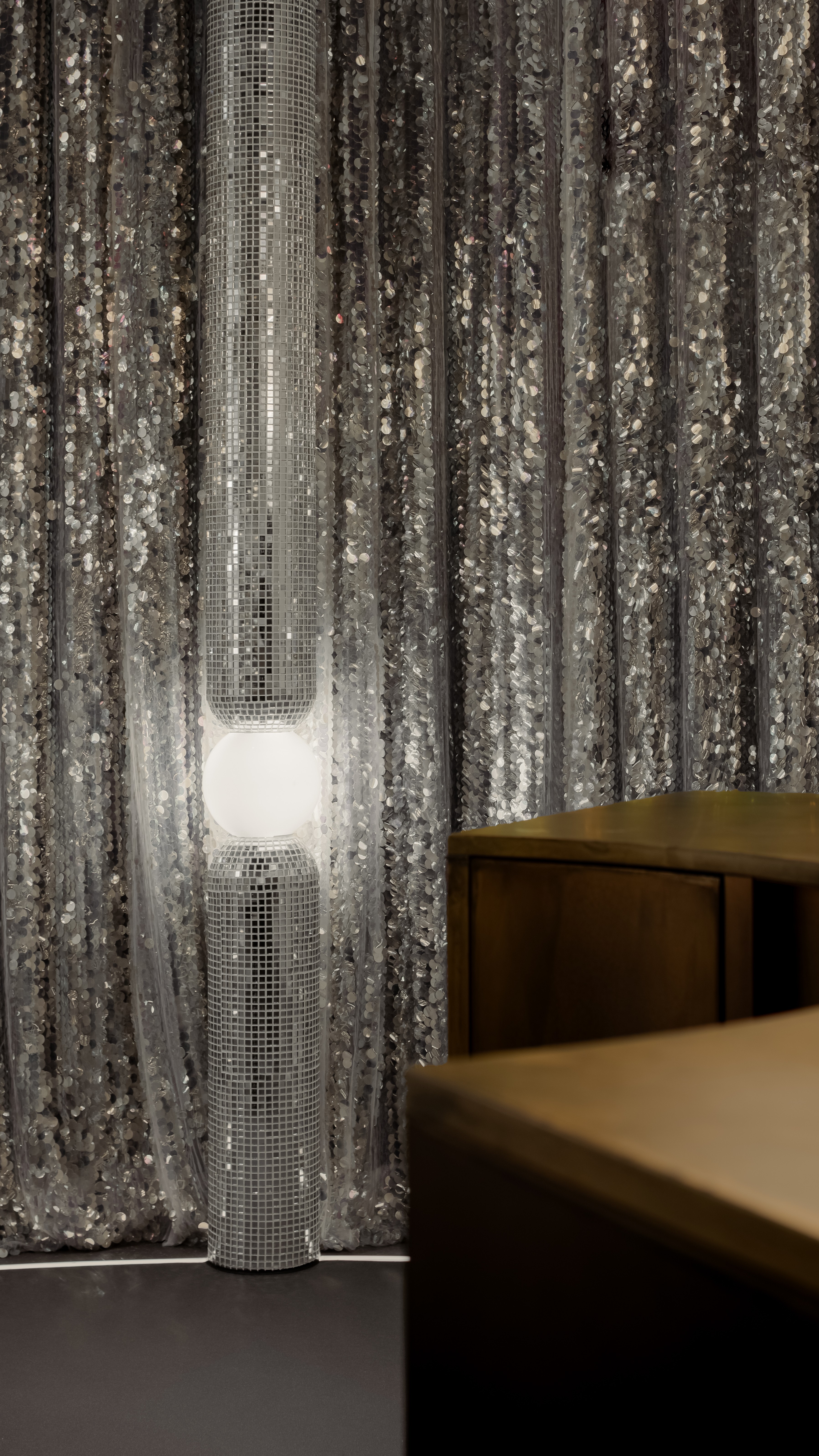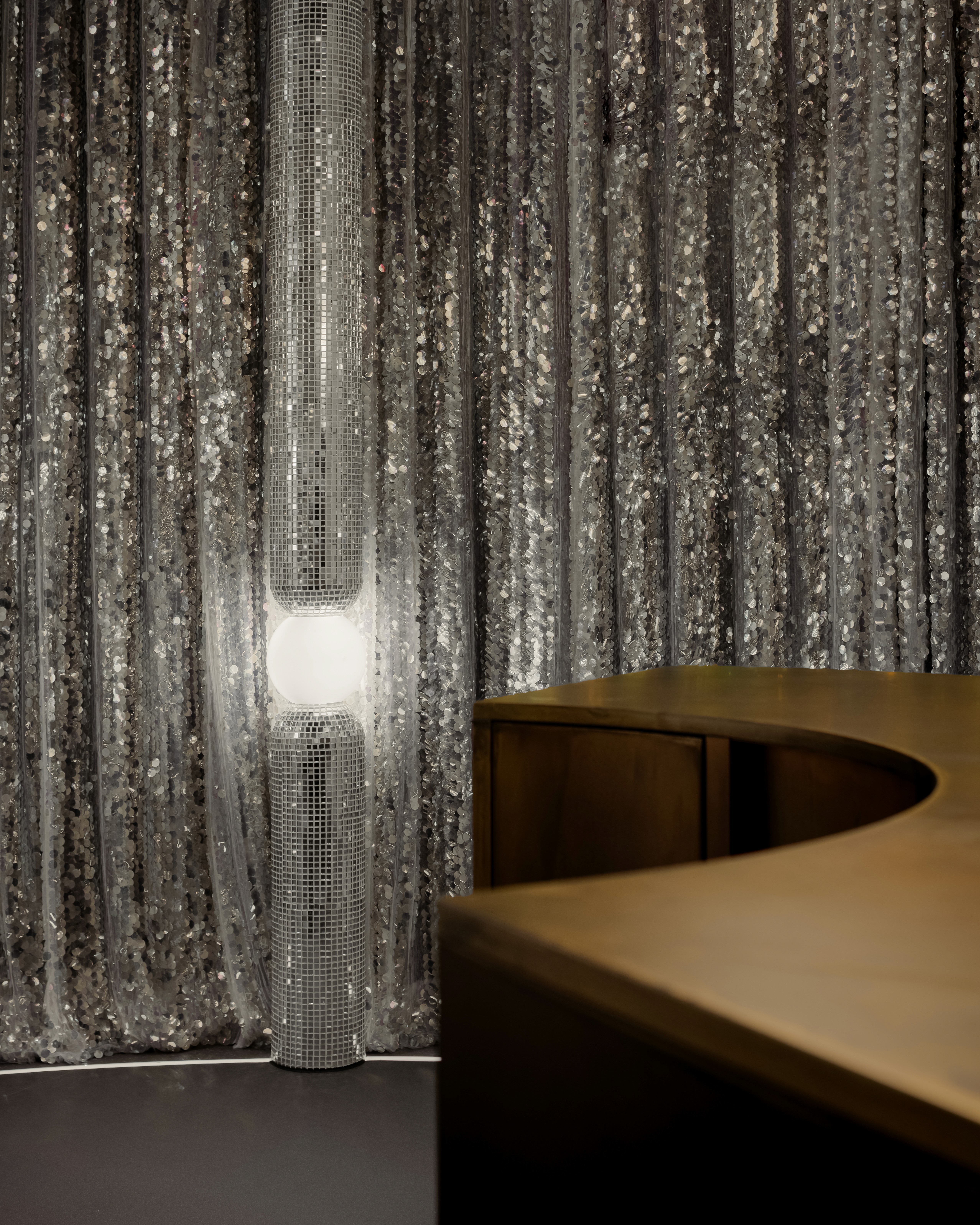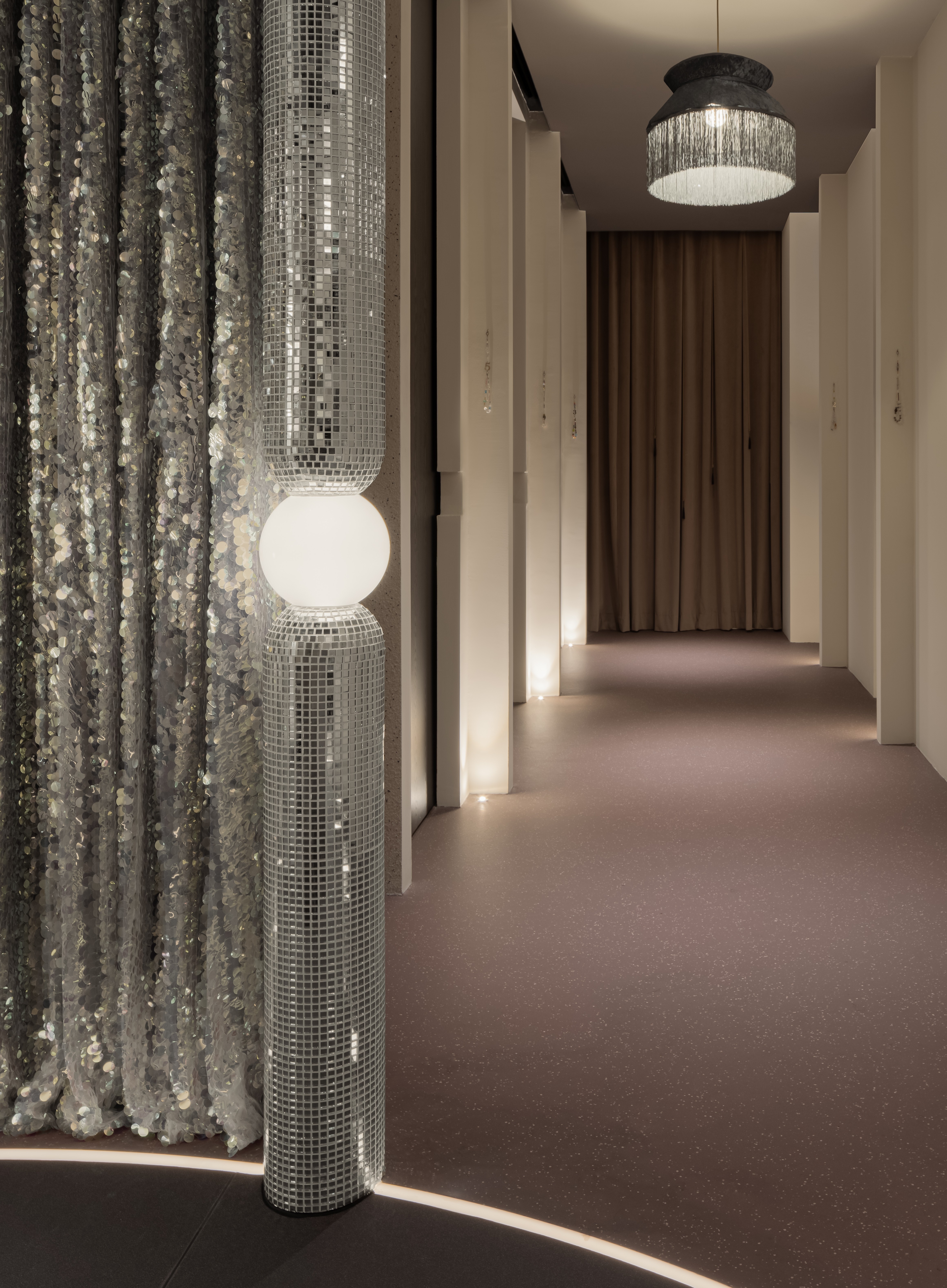 Inspired by women in armor, this beauty salon wraps strength in softness. Curved lines flow through mirror tiles, silver chains, brass accents and glowing round lights, each reflective surface celebrating resilience, each gentle form honoring grace. Crystals and glass guide the way like modern talismans, catching the light and carrying quiet power.