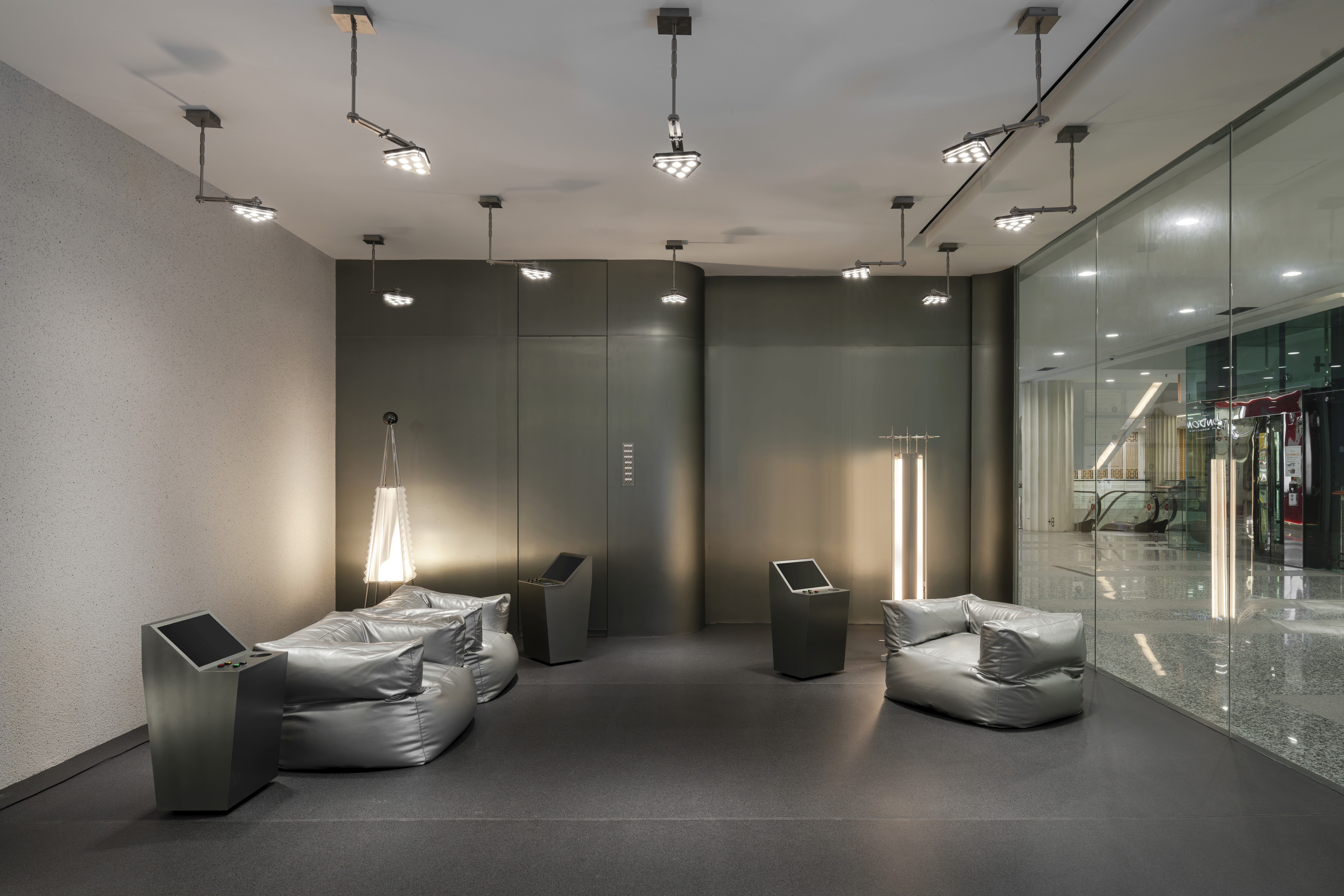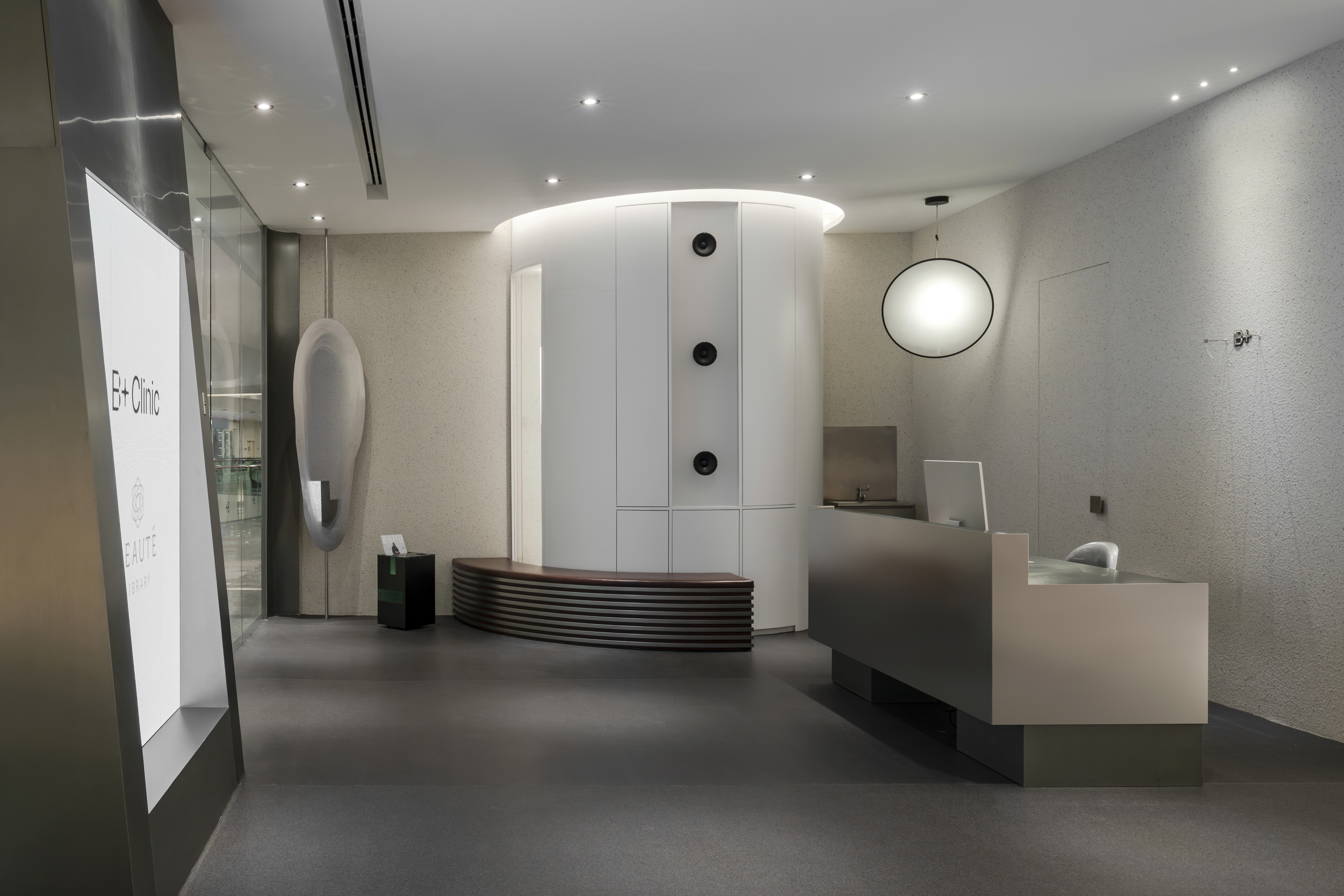 A vision of the future, this beaute clinic interior is inspired by the precision of labs and the elegance of advanced technology. Clean lines, mirrored reflections, and directional lighting come together to create a sleek, hyper-modern environment.