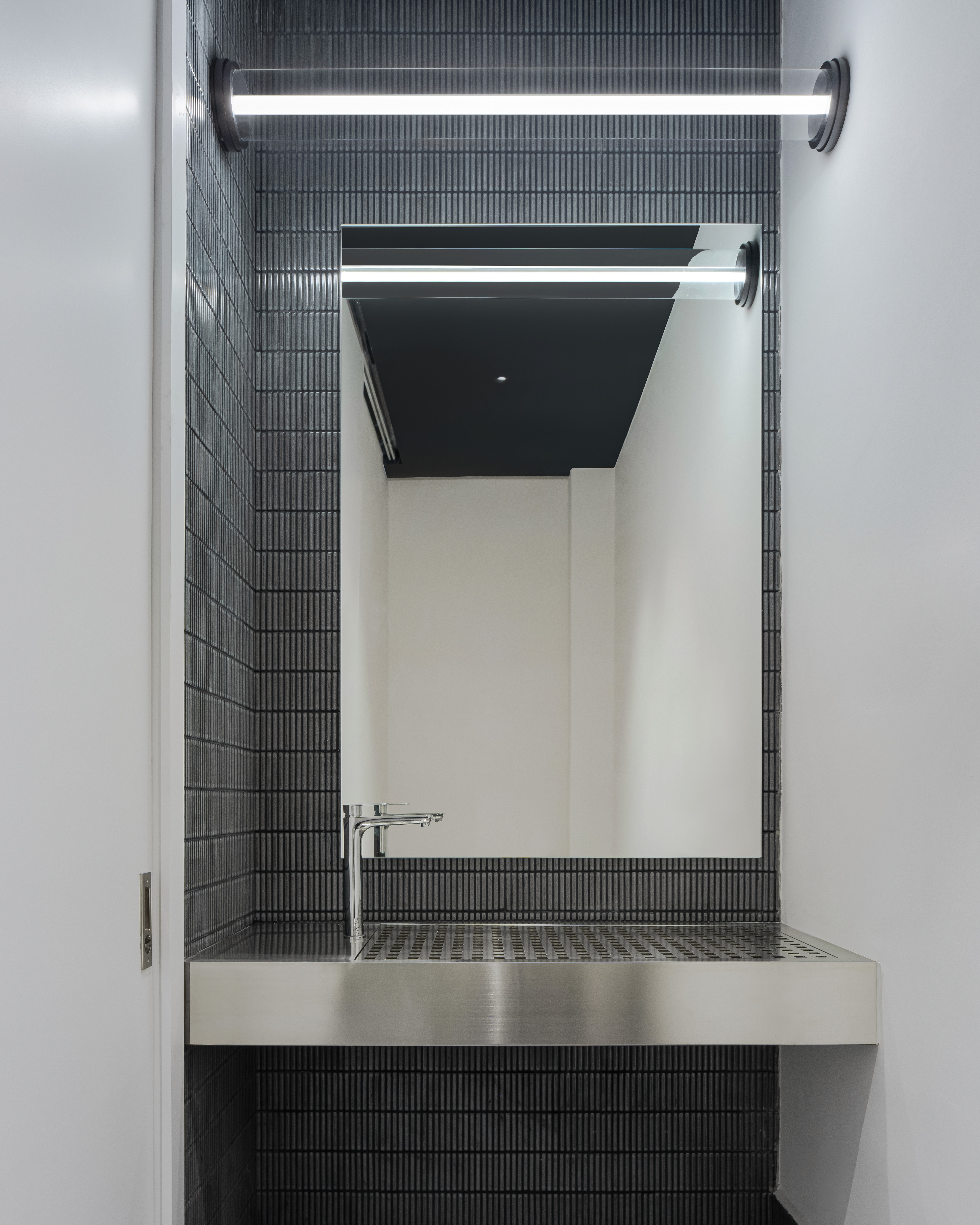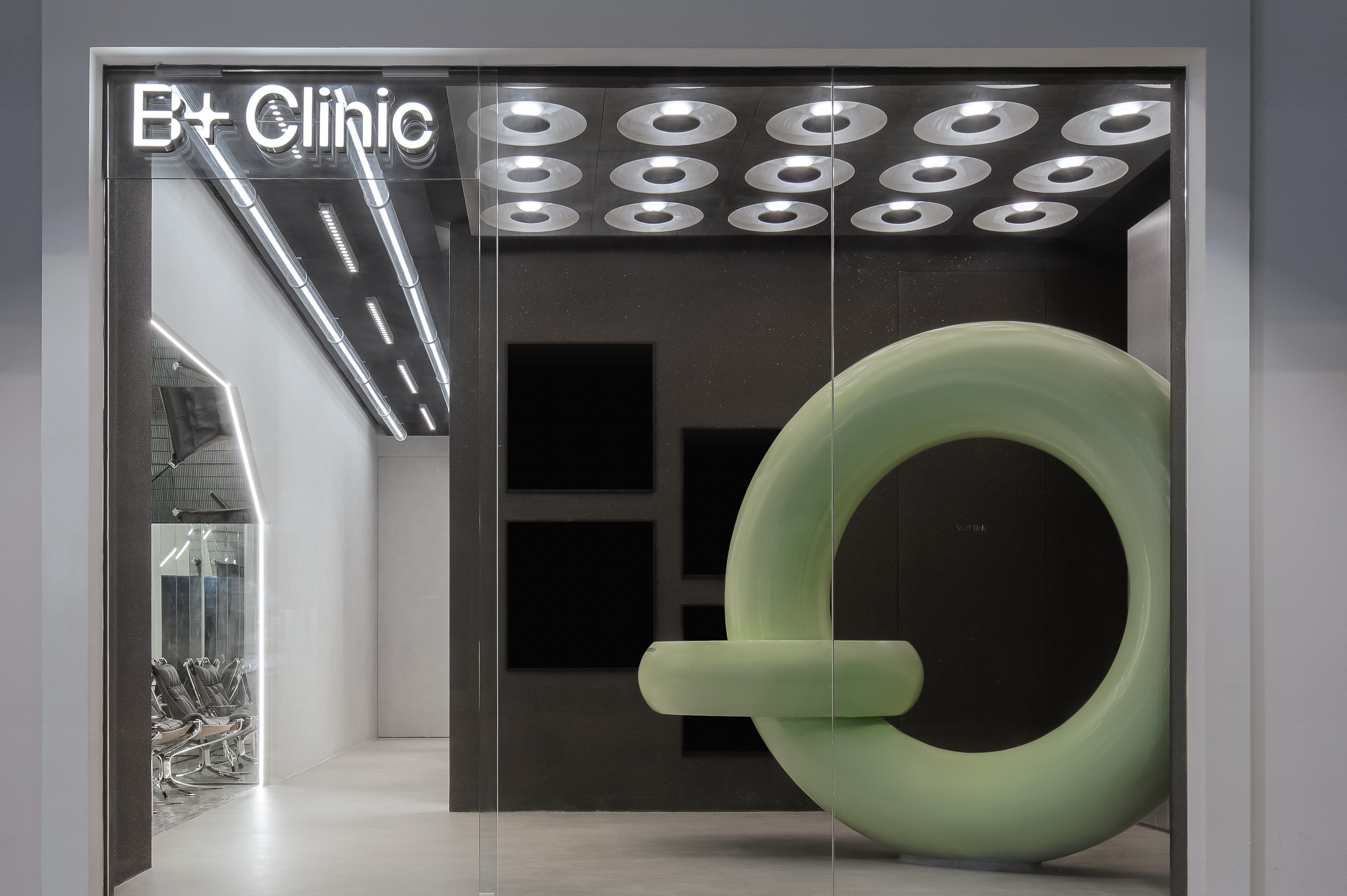 A fresh take on aesthetic clinic design where soft curves meet raw contrast. A bold green donut reception anchors the space, surrounded by stainless lamps and reflective surfaces that dance with light. Raw flooring and textured walls ground the atmosphere, creating a balance between clinical precision and organic calm. Modern, tactile, and effortlessly fresh.