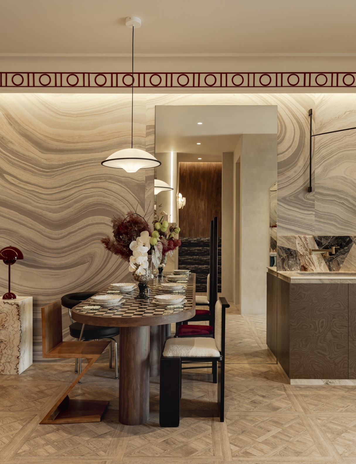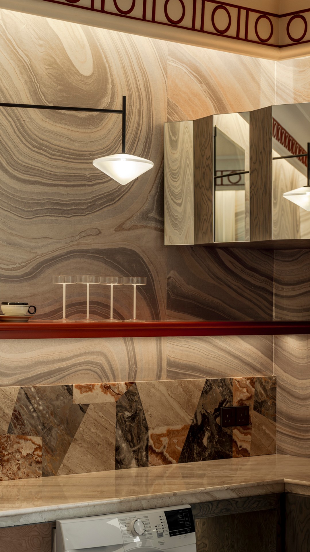 Attention to detail is paramount, with special treatments and materials gracing every corner. Expensive textured walls add depth and dimension, while carefully curated textures and colors enhance the visual appeal of each room. In the kitchen, a stunning marble-patterned backsplash serves as the focal point, adding a touch of timeless elegance to the culinary space. Above, intricately patterned cornices adorn the ceiling, elevating the room's architectural charm.