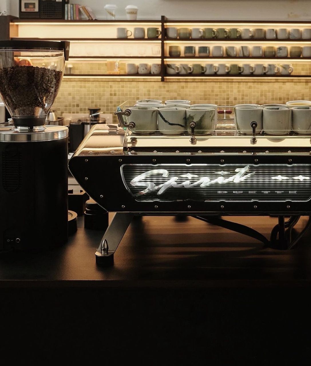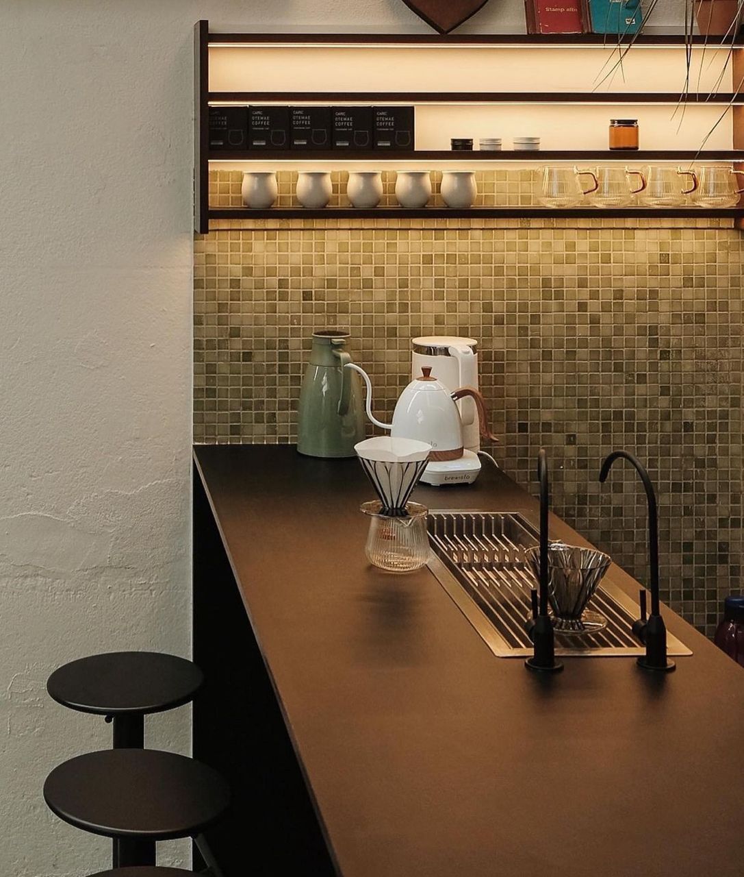 The café's aesthetic is further enhanced by the presence of green swimming pool tiles that adorn the floor and walls, adding a splash of color and personality to the surroundings. Together, these elements create an inviting atmosphere that beckons guests to linger and savour an array of freshly baked goods and culinary delights.