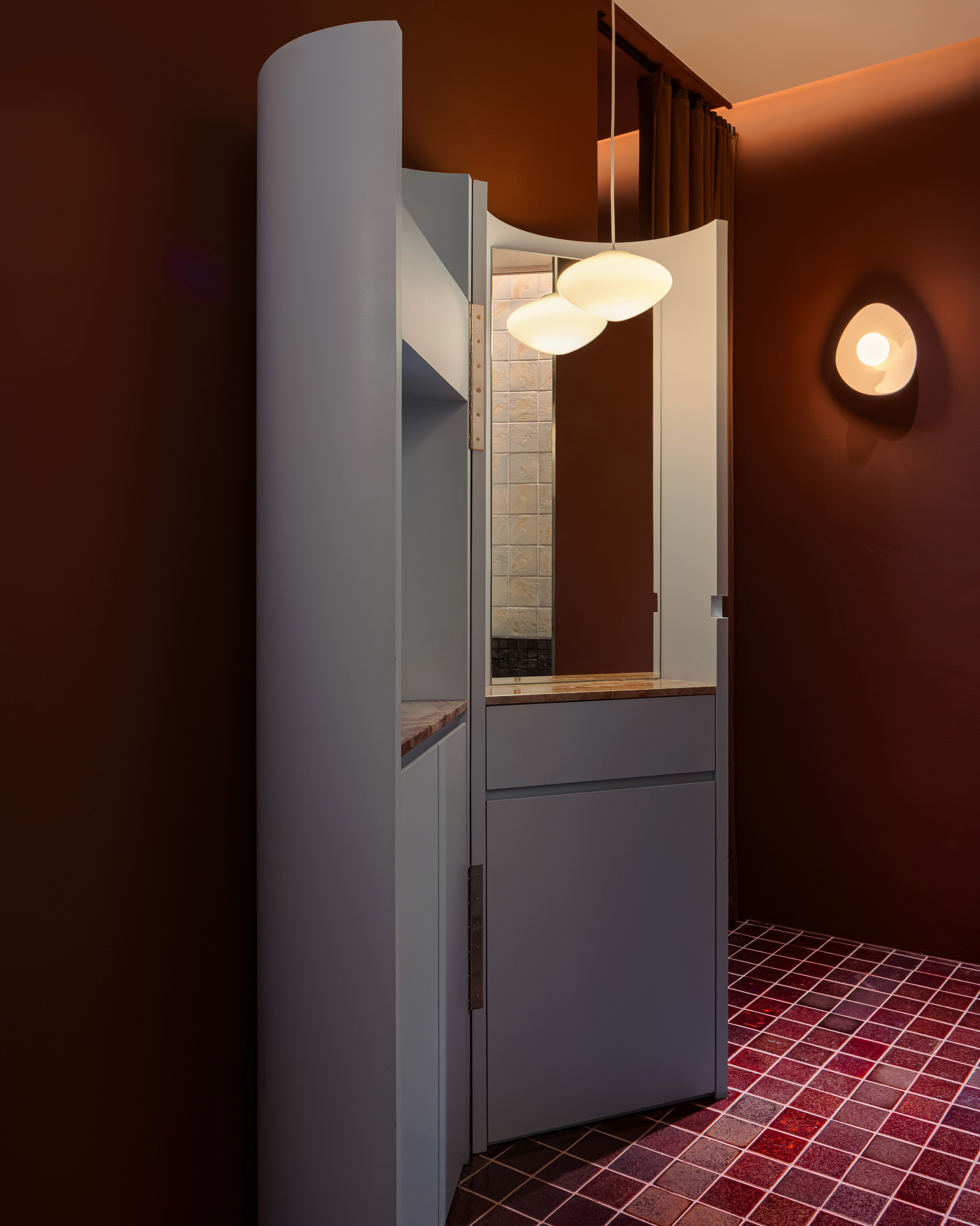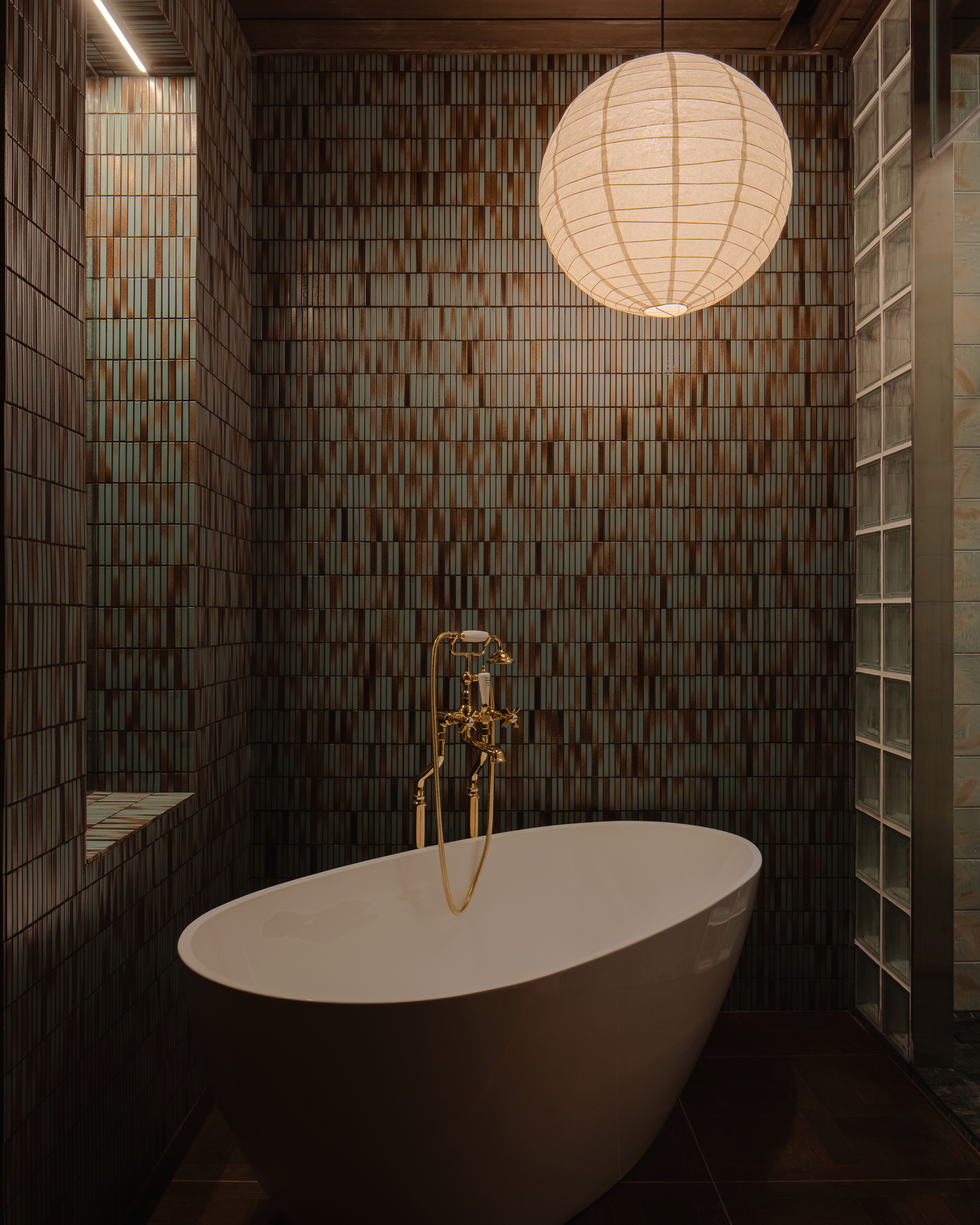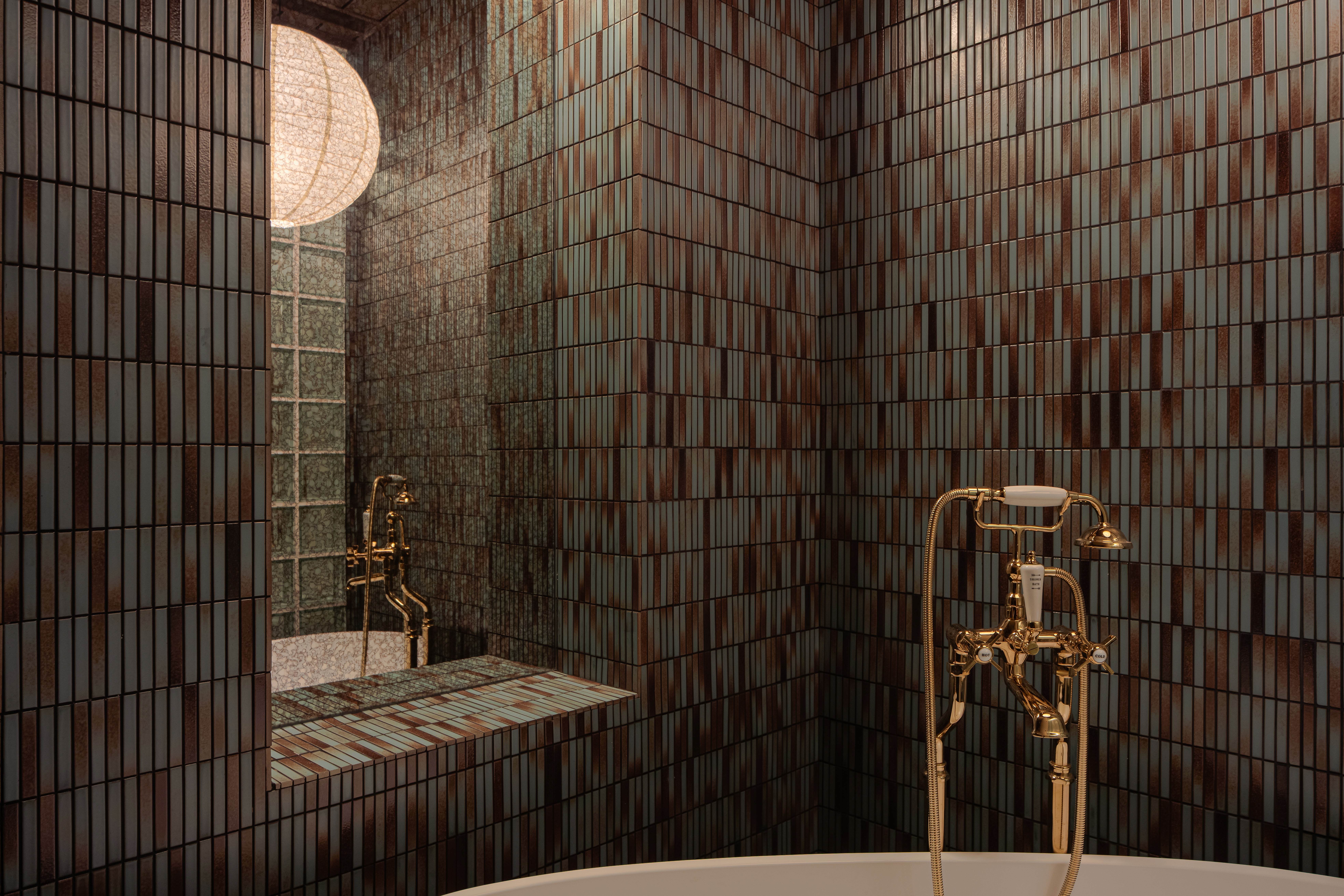 A spa woven with ceramics. Handmade tiles, handles, even a cabinet that dances on ceramic feet. Every detail is touched by hands, carrying warmth into the space. Each piece a fragment of a material poem, inviting you to feel the warmth of touch.