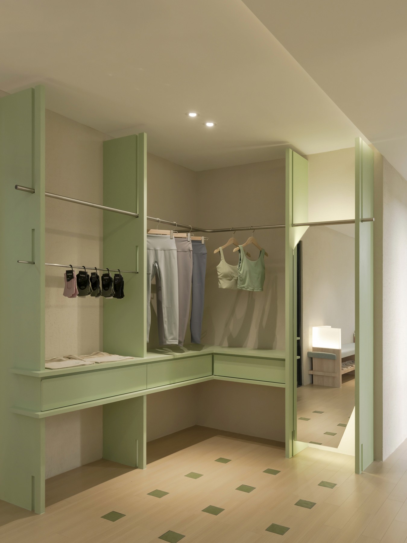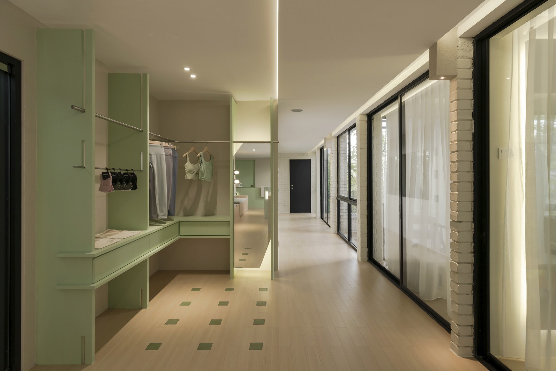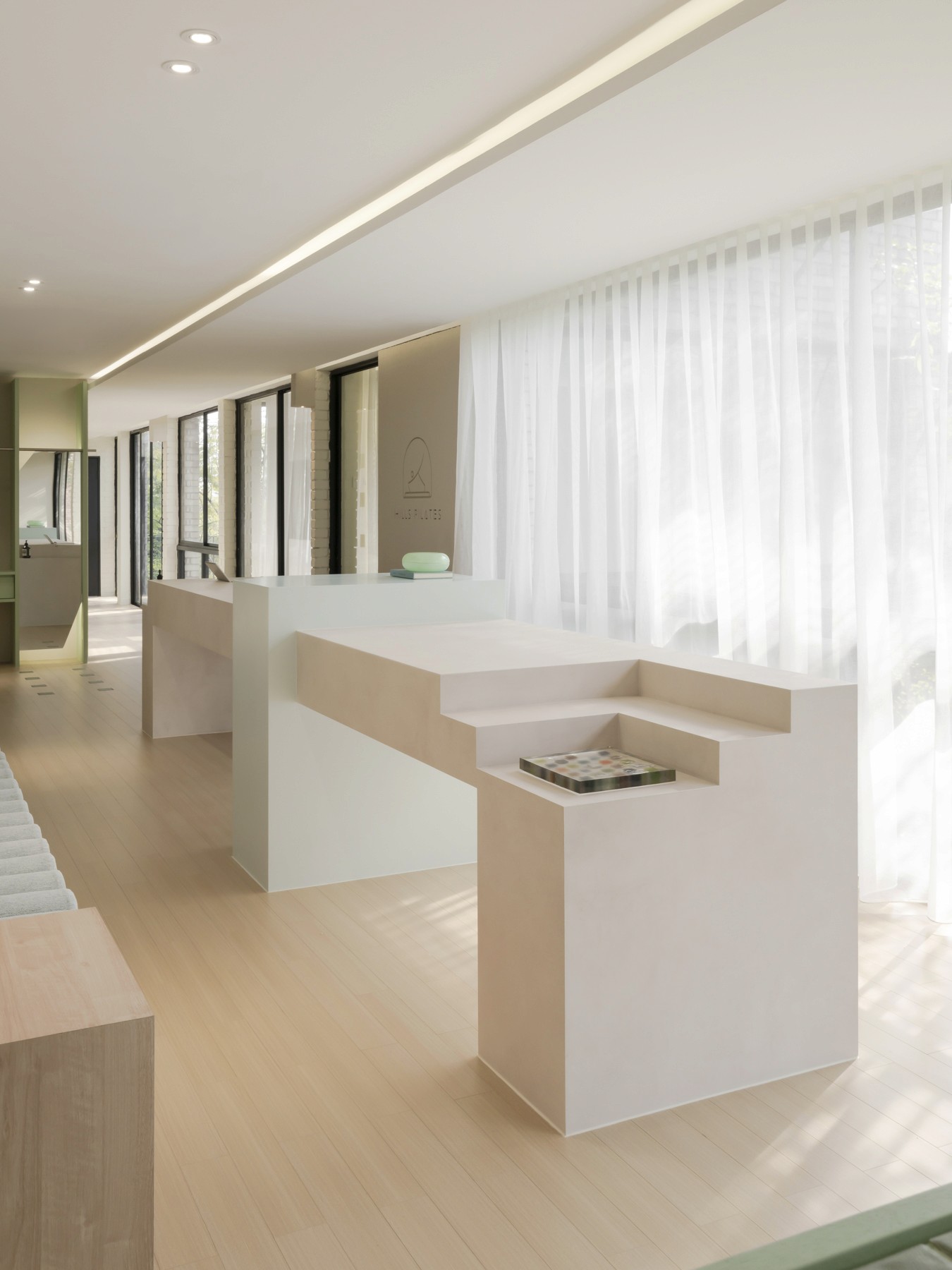 Hills Pilates, where tranquility and rejuvenation intertwine in a space designed to elevate both body and soul. The interior design ethos embraces simplicity and serenity, complemented by the verdant hues of the client’s signature green branding color.